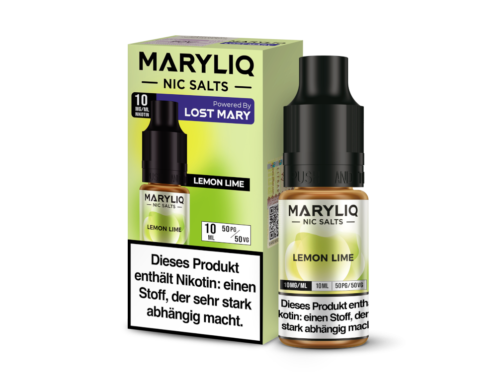 Das Nikotinsalz-Liquid Lemon Lime der Marke MARYLIQ besticht durch seinen kühlen Geschmack nach Zitrone und Limette. Diese Sorte ist mit den Nikotinstärken von 10 mg/ml und 20 mg/ml erhältlich. Im Gegensatz zu herkömmlichen Aromen kann dieses NicSalt direkt in Ihrer E-Zigarette verwendet werden. Pro bestellter Flasche erhalten Sie 10 ml des MARYLIQ Lemon Lime Nikotinsalz-Liquids.Auszeichnung gemäß CLP-Verordnung (EG) Nr. 1272/2008
