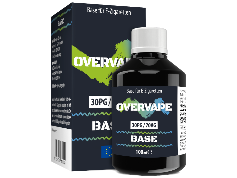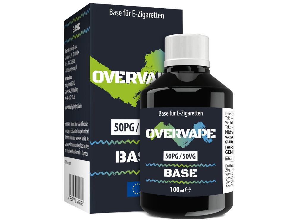 Die Overvape Base ist in den Mischungsverhältnissen 50%PG/50%VG sowie 30%PG/70%VG erhältlich. Zu beachten ist bei den Mischungsverhältnissen, dass ein höherer PG-Anteil für einen intensiveren Geschmack sorgt. Eine dichtere Dampfentwicklung wird mit einem höheren VG-Anteil erzielt. Beide nikotinfreien und geschmacksneutralen Basen erhalten Sie jeweils in einer 100 ml fassenden Flasche mit 100 ml Inhalt..