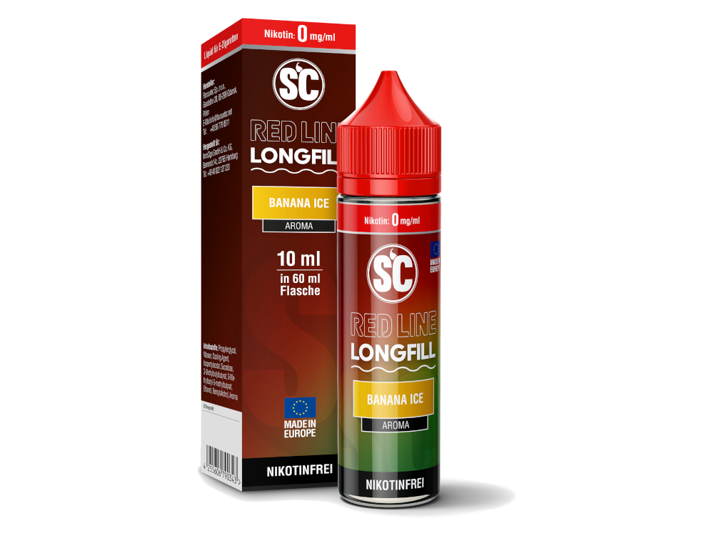 Von der Marke SC kommen die Red Line Longfill Aromen, welche Ihnen in einer 60 ml Flasche mit 10 ml Inhalt geliefert werden. Die Aromen sind höher konzentriert als die vorgefertigten Liquids, weshalb das Dampfen in einem unverdünnten Zustand nicht empfohlen wird. Die Sorte Banana Ice schmeckt beim Verdampfen mit einer E-Zigarette nach Bananen und einem Hauch von Frische.