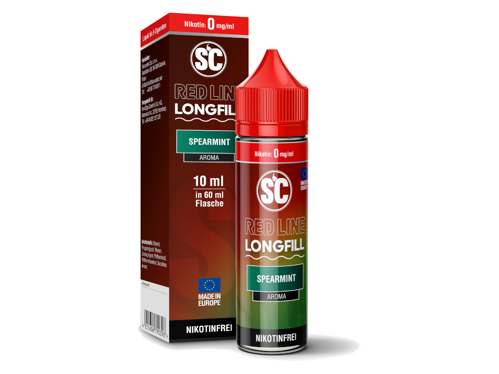 Von der Marke SC kommen die Red Line Longfill Aromen, welche Ihnen in einer 60 ml Flasche mit 10 ml Inhalt geliefert werden. Die Aromen sind höher konzentriert als die vorgefertigten Liquids, weshalb das Dampfen in einem unverdünnten Zustand nicht empfohlen wird. Die Sorte Spearmint schmeckt beim Verdampfen mit einer E-Zigarette nach Minze und Menthol.