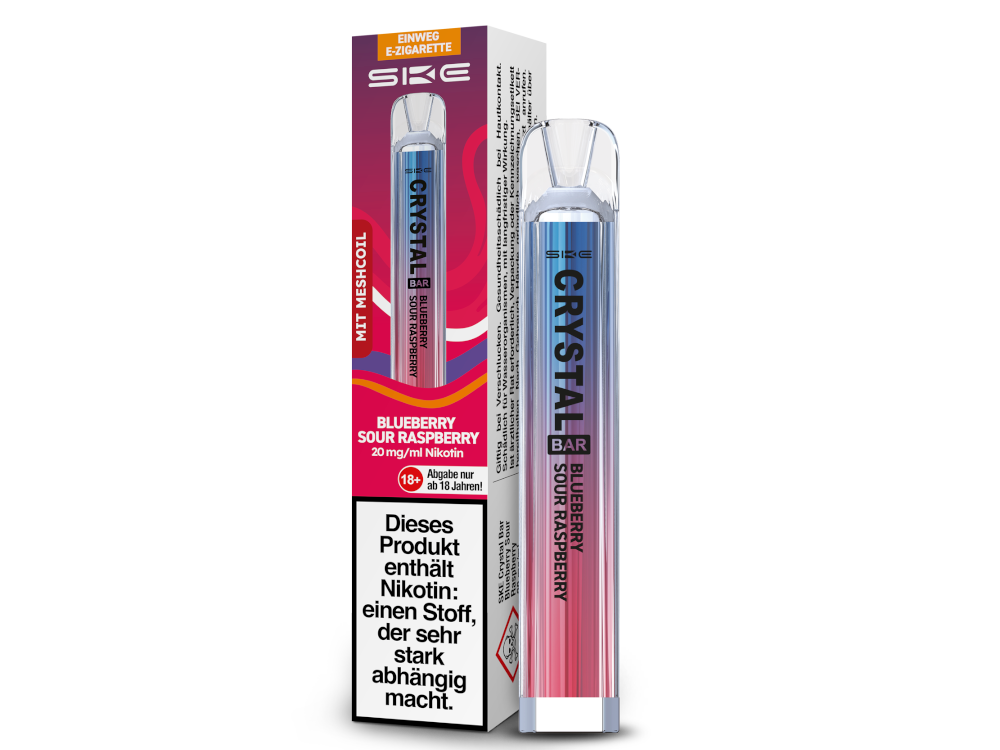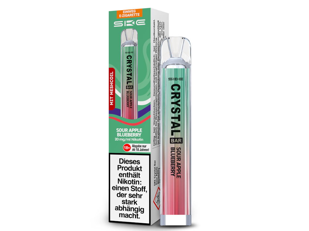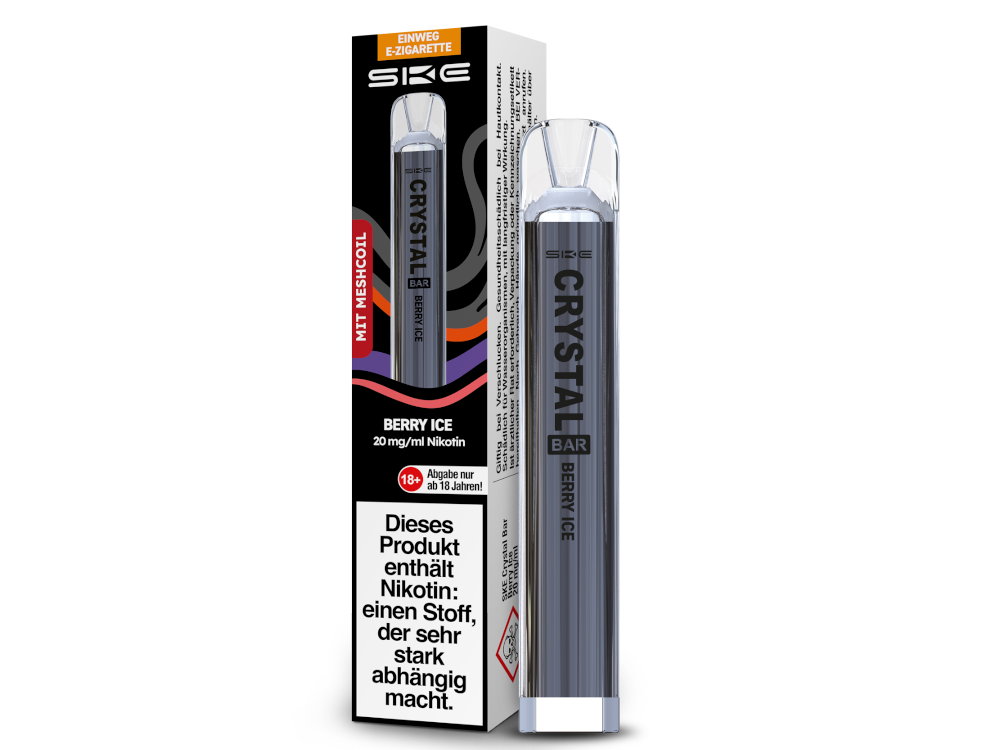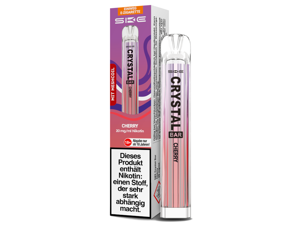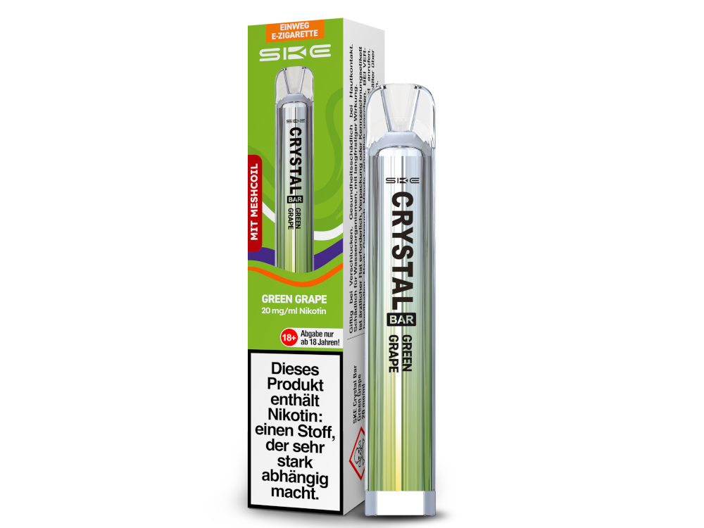 Die SKE Crystal Bar ist eine Einweg-E-Zigarette, die für den einmaligen Gebrauch gedacht ist. Anders als herkömmliche E-Zigaretten muss man sie nicht zusammenbauen, warten oder Teile austauschen. Sie hat einen eingebauten 350 mAh Akku, der nicht ausgetauscht oder aufgeladen werden kann. Laut Hersteller hält der Akku für etwa 600 Züge, wobei die genaue Zahl je nach Nutzungsgewohnheiten variieren kann. Mit dem 2 ml Tank hat man genug Liquid für den täglichen Bedarf. Weder Akku noch Pod sind wiederaufladbar oder nachfüllbar. Ist der Tank leer oder der Akku aufgebraucht, muss die E-Zigarette fachgerecht entsorgt werden. Ein Highlight der SKE Crystal Bar ist die Auswahl an 27 verschiedenen Geschmacksrichtungen, die für jeden etwas bieten.