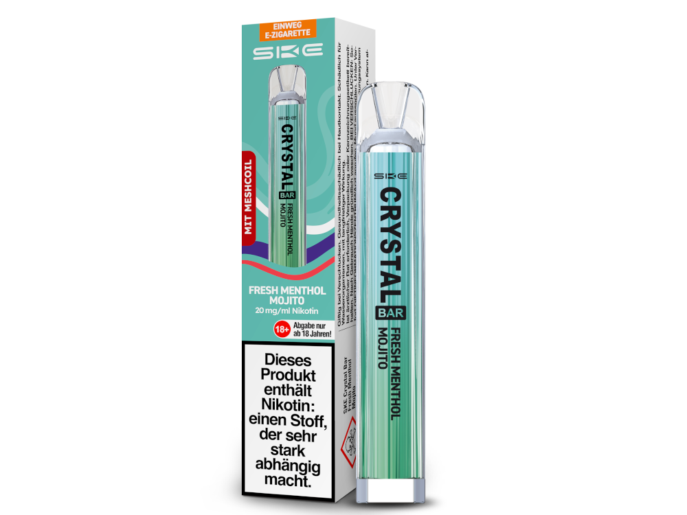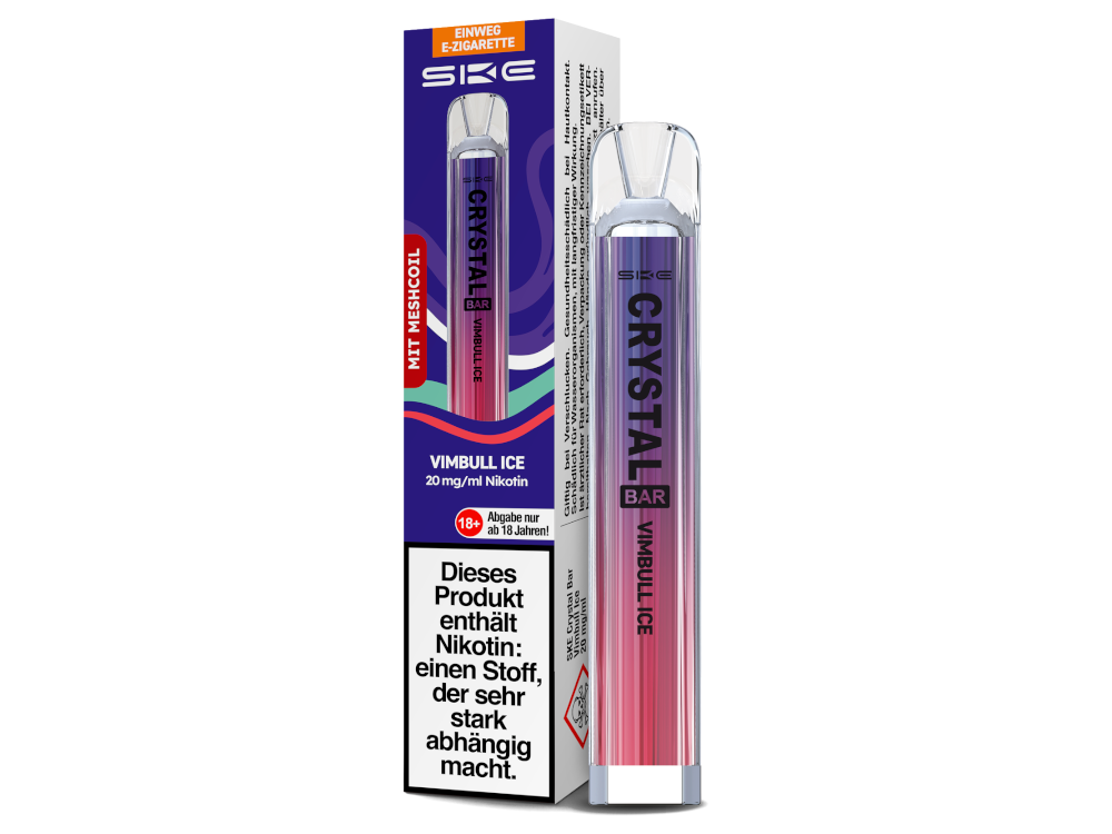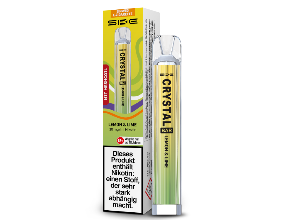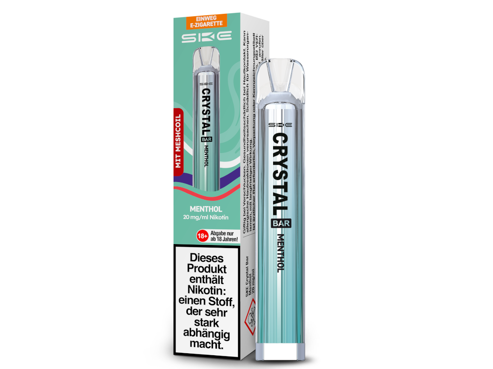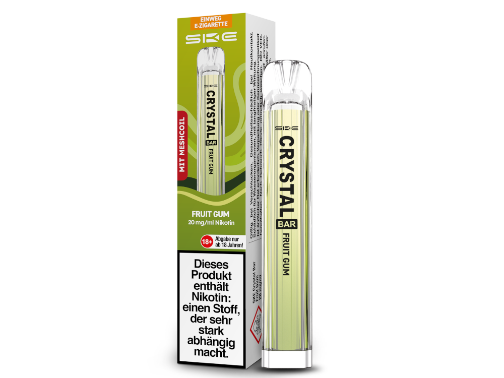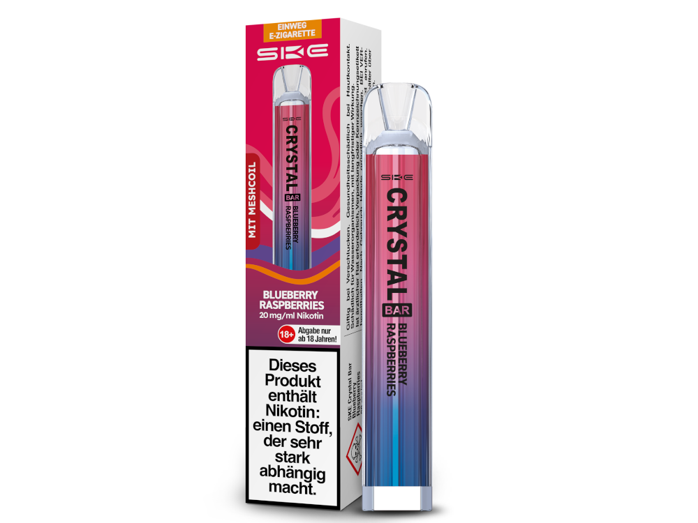 Die SKE Crystal Bar ist eine Einweg-E-Zigarette, die für den einmaligen Gebrauch gedacht ist. Anders als herkömmliche E-Zigaretten muss man sie nicht zusammenbauen, warten oder Teile austauschen. Sie hat einen eingebauten 350 mAh Akku, der nicht ausgetauscht oder aufgeladen werden kann. Laut Hersteller hält der Akku für etwa 600 Züge, wobei die genaue Zahl je nach Nutzungsgewohnheiten variieren kann. Mit dem 2 ml Tank hat man genug Liquid für den täglichen Bedarf. Weder Akku noch Pod sind wiederaufladbar oder nachfüllbar. Ist der Tank leer oder der Akku aufgebraucht, muss die E-Zigarette fachgerecht entsorgt werden. Ein Highlight der SKE Crystal Bar ist die Auswahl an 27 verschiedenen Geschmacksrichtungen, die für jeden etwas bieten.
