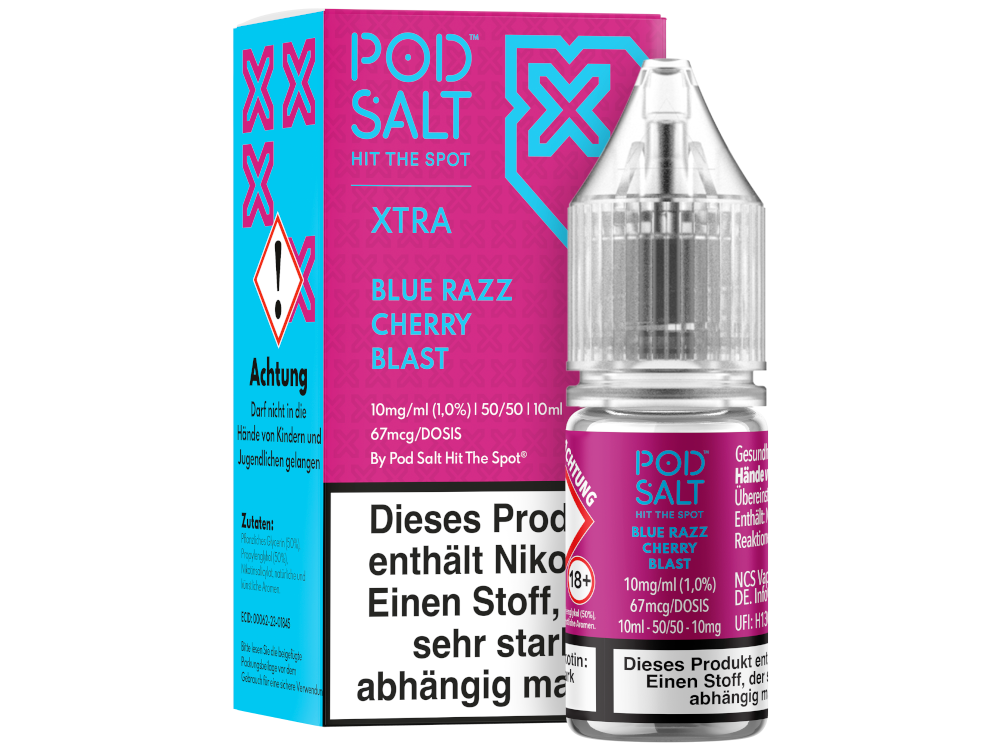 Das Blue Razz Cherry Blast Nikotinsalz Liquid von Pod Salt X schmeckt beim Dampfen nach blauer Himbeere, Kirsche und kühle. Sie erhalten pro bestellter Einheit eine 10 ml Flasche mit 10 ml Inhalt. Das Nikotinsalz Liquid können Sie mit 10 mg/ml oder 20 mg/ml Nikotin dampfen. Es ist für den direkten Gebrauch in Ihrer E-Zigarette geeignet.Auszeichnung gemäß CLP-Verordnung (EG) Nr. 1272/2008