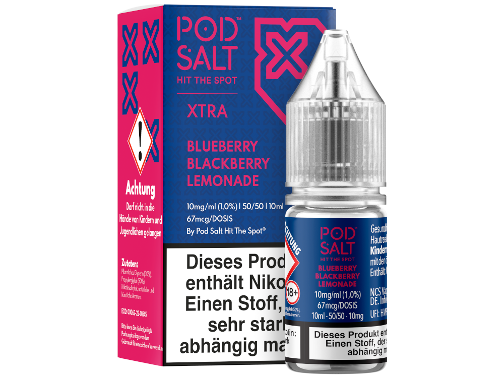 Das Blueberry Blackberry Lemonade Nikotinsalz Liquid von Pod Salt X schmeckt beim Dampfen nach einer Blaubeer-Brombeer-Limonade. Sie erhalten pro bestellter Einheit eine 10 ml Flasche mit 10 ml Inhalt. Das Nikotinsalz Liquid können Sie mit 10 mg/ml oder 20 mg/ml Nikotin dampfen. Es ist für den direkten Gebrauch in Ihrer E-Zigarette geeignet.Auszeichnung gemäß CLP-Verordnung (EG) Nr. 1272/2008