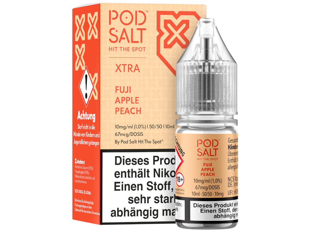Das Fuji Apple Peach Nikotinsalz Liquid von Pod Salt X schmeckt beim Dampfen nach Apfel und Pfirsich. Sie erhalten pro bestellter Einheit eine 10 ml Flasche mit 10 ml Inhalt. Das Nikotinsalz Liquid können Sie mit 10 mg/ml oder 20 mg/ml Nikotin dampfen. Es ist für den direkten Gebrauch in Ihrer E-Zigarette geeignet.Auszeichnung gemäß CLP-Verordnung (EG) Nr. 1272/2008