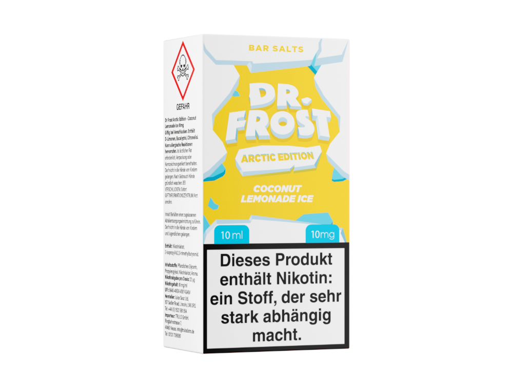 Coconut Lemonade Ice, ein Nikotinsalz Liquid der Arctic Edition von Dr. Frost, vereint beim Dampfen die Aromen von Kokosnuss, Limonade und Kühle. Dieses Nikotinsalz Liquid ist in den Stärken 10 mg/ml und 20 mg/ml erhältlich und wird in einer praktischen 10 ml Flasche geliefert. Es ist für den direkten Einsatz in Ihrer E-Zigarette vorgesehen und sofort nach Erhalt gebrauchsfertig.Auszeichnung gemäß CLP-Verordnung (EG) Nr. 1272/2008