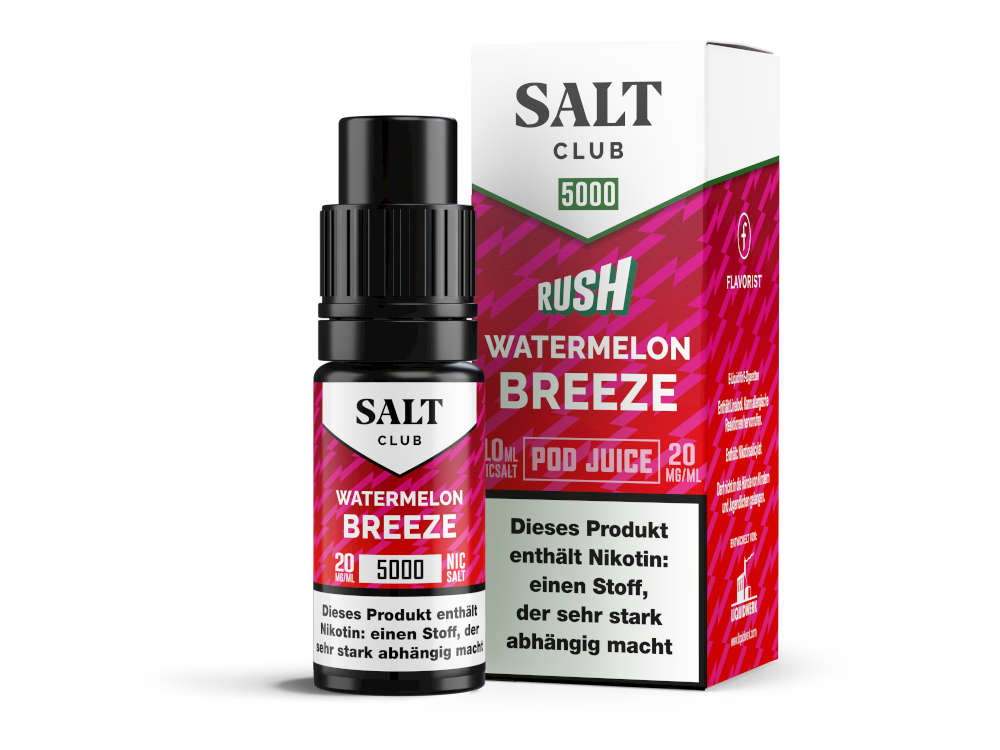 Mit dem Nikotinsalz Liquid Watermelon Breeze aus dem Hause Salt Club erhalten Sie ein Liquid, das Teil der Salt Club 5000 Serie ist und beim Dampfen mit einer E-Zigarette nach Wassermelone und einer frischen Note schmeckt. Bei der Bestellung erhalten Sie eine 10 ml Flasche, die mit 10 ml des NicSalts gefüllt ist. Die Nikotinsalz-Liquids von Salt Club sind gebrauchsfertige Liquids und daher für den direkten Gebrauch in Ihrer E-Zigarette geeignet. Das Watermelon Breeze Nikotinsalz Liquid erhalten Sie in der Nikotinstärke von 20 mg/ml.Auszeichnung gemäß CLP-Verordnung (EG) Nr. 1272/2008