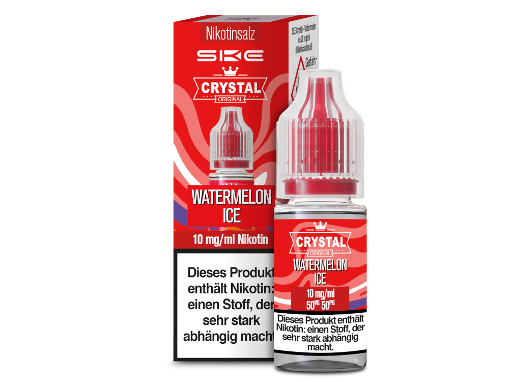 Pro 10 ml Flasche erhalten Sie Niktoinsalz Liquid der Marke SKE Crystal. Die Sorte Watermelon Ice entfaltet beim Verdampfen mit einer E-Zigarette den Geschmack von Wassermelone mit einem Hauch von Frische. Die Stärke der SKE Crystal Nikotinsalz Liquids beträgt entweder 10 mg/ml und 20 mg/ml.Auszeichnung gemäß CLP-Verordnung (EG) Nr. 1272/2008